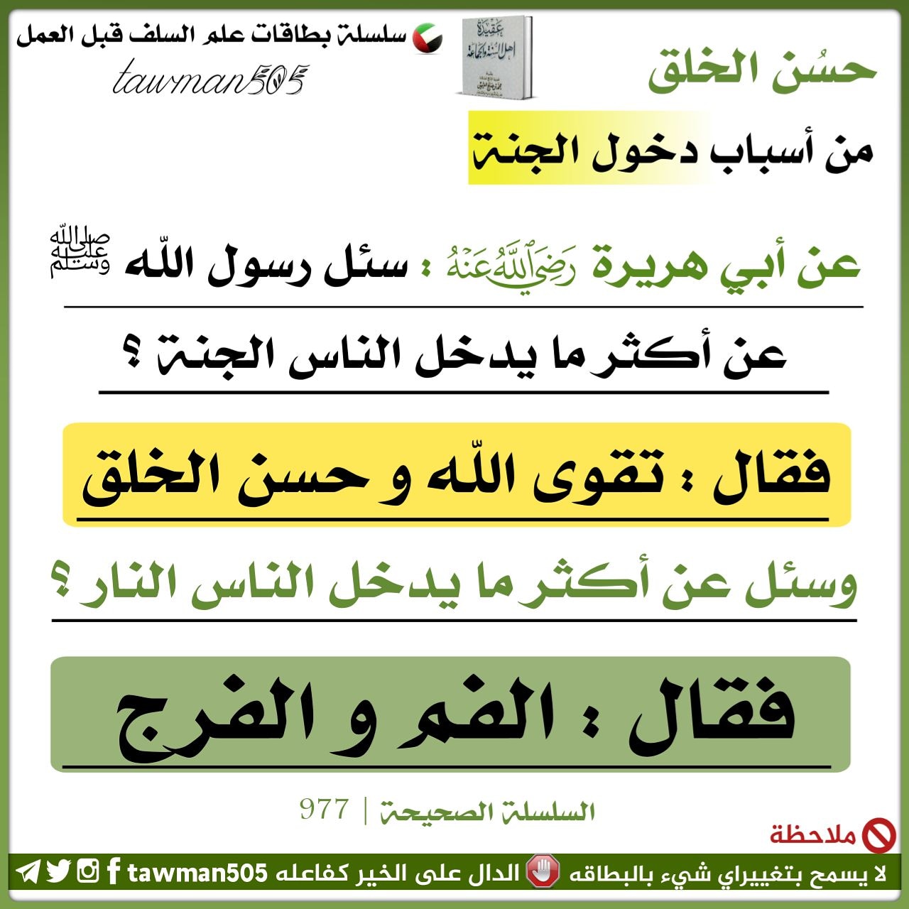 علم السلف قبل العمل Twitter પર عن أبي هريرة رضي الله عنه سئل رسول الله ﷺ عن أكثر ما يدخل الناس الجنة فقال تقوى الله و حسن الخلق وسئل