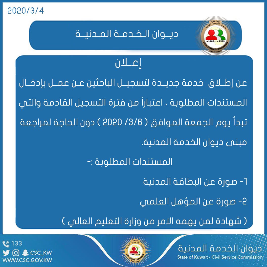 ديوان الخدمة المدنية בטוויטר إعلان ديوان الخدمة المدنية عن إطلاق خدمة جديدة لفـترة تسجيل الباحثين عن عمل التي تبدأ يوم الجمعة 2020 3 6