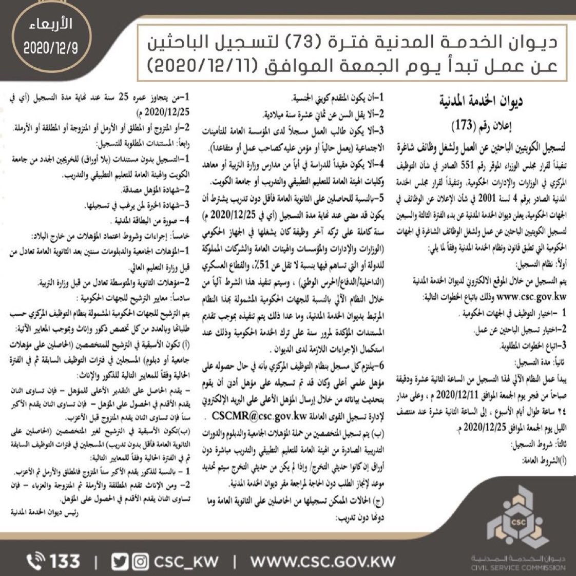 صحيفة الإرادة ديوان الخدمة المدنية تسجيل الكويتيين الباحثين عن عمل من يوم الجمعة الموافق 2020 12 11 عبر هذا الموقع