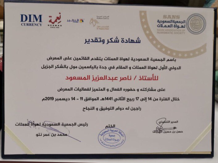 ابومحمد العقيل العريني On Twitter اهنى الأخ ناصر المسعود على حصوله على شهادة من الجمعية السعودية لهواة العملات بالتوفيق