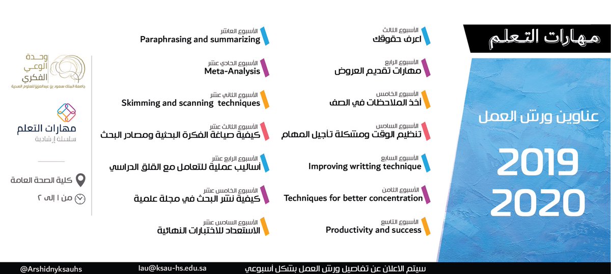أرشــدنــي On Twitter عناوين ورش عمل برنامج مهارات التعلم الذي يسعى لتوجيه الطالب والطالبة إلى طرق النجاح والتفوق الدراسي وتخطي الصعوبات والضغوطات Https T Co 5nlsa5wnfx