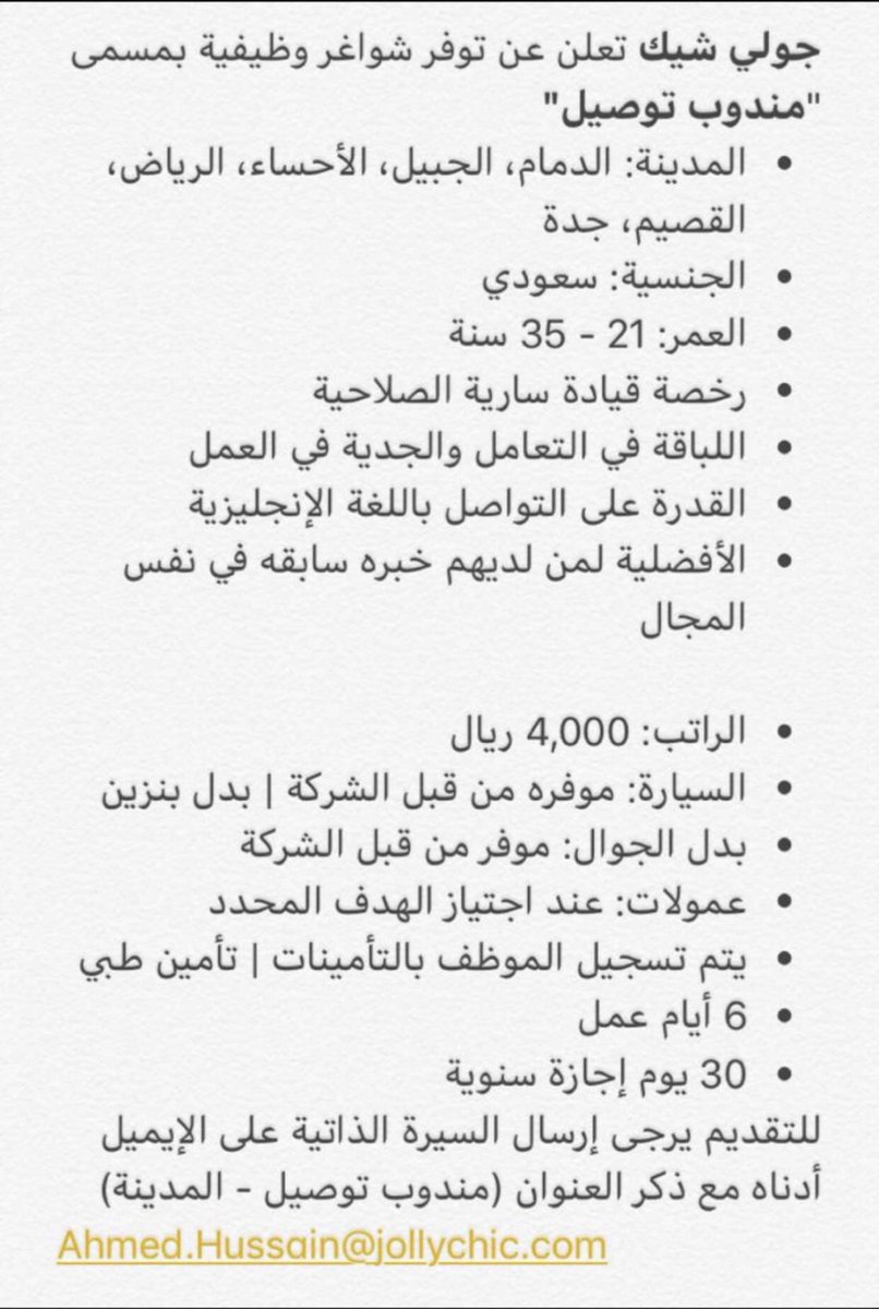 مهند وظائف القصيم On Twitter وظائف رجالية شاغرة بجولي شيك بعدة مدن بالمملكه بمسمى مندوب توصيل ترسل السيرة الذاتيه للإيميل Ahmed Hussain Jollychic Com Https T Co R1k9dc1qc8