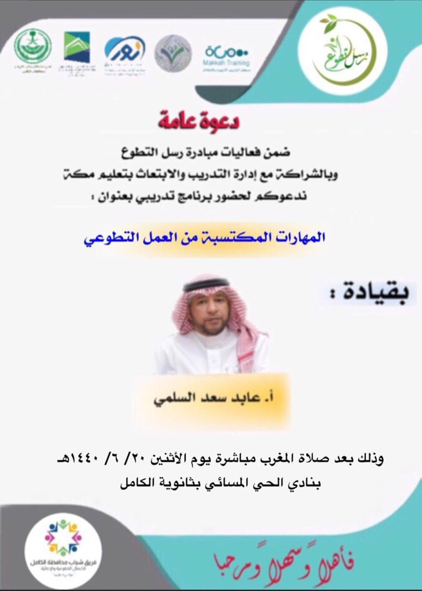نادي الحي بالكامل On Twitter تنفيذ برنامج تدريب بعنوان المهارات المكتسبة من العمل التطوعي ضمن مبادرات رسل التطوع وذلك بالشراكة مع مركز التدريب التربوي بالكامل وجمعية نور واللجنة الثقافية والشبابية بمحافظة الكامل