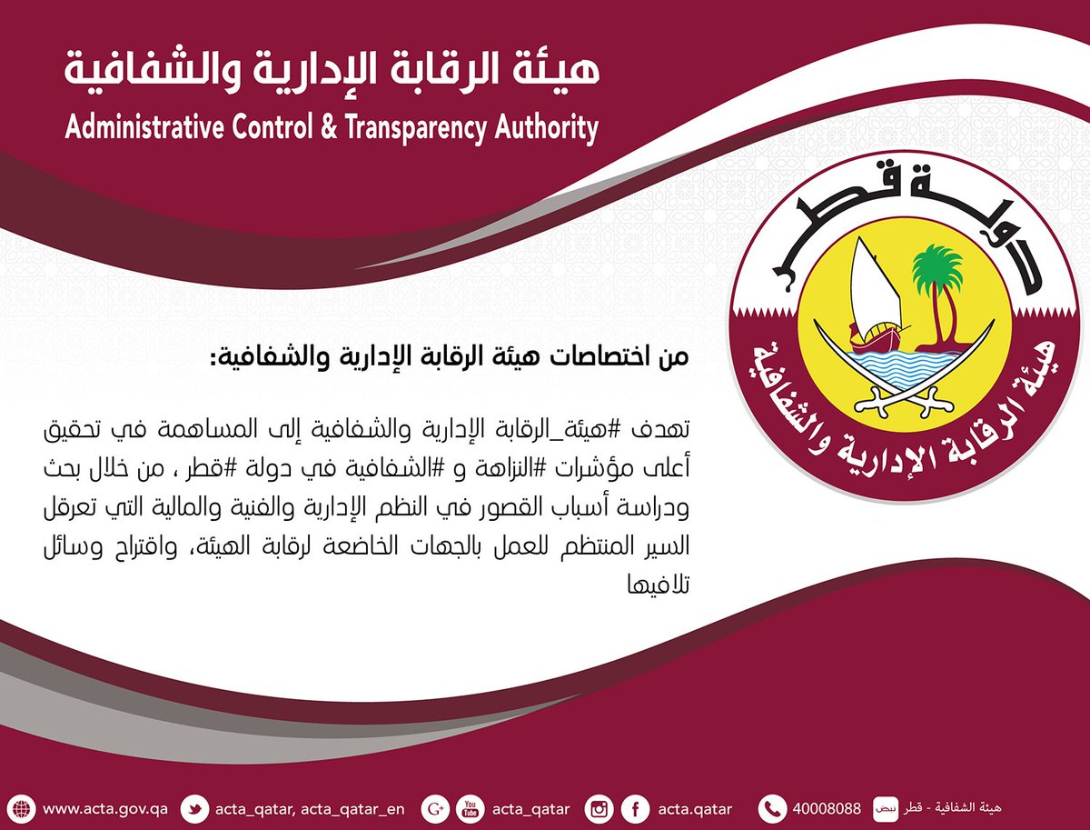 هيئة الرقابة Twitterren تهدف هيئة الرقابة الإدارية والشفافية إلى المساهمة في تحقيق أعلى مؤشرات النزاهة و الشفافية في دولة قطر من خلال بحث ودراسة أسباب القصور في النظم الإدارية والفنية والمالية التي